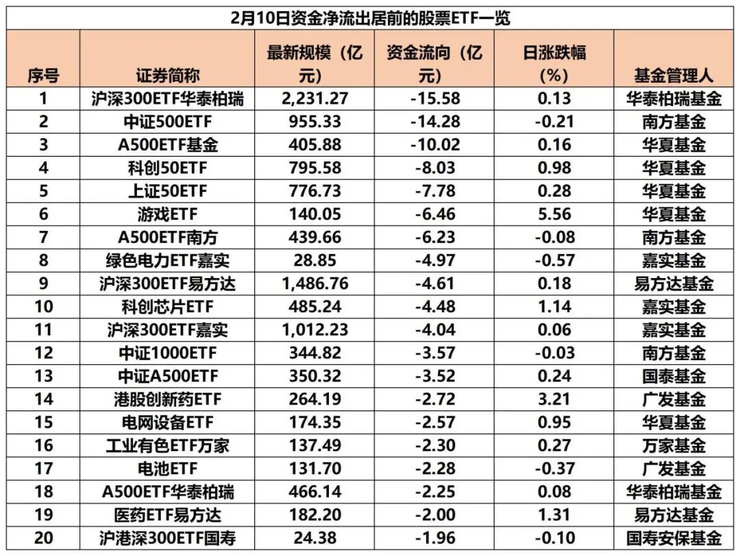 从单日资金净流出排行看,沪深300ETF、中证500ETF、科创50ETF等宽基ETF成为“失血”大户。