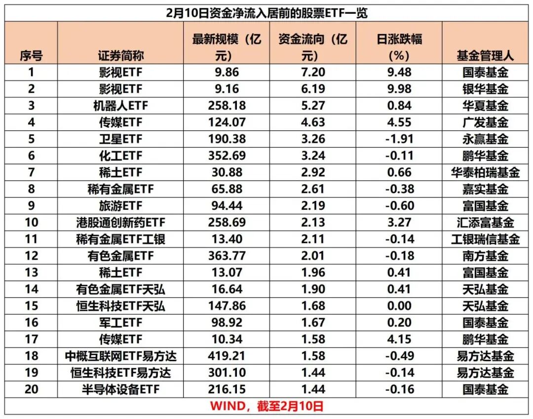 2月10日,市场全天窄幅震荡,传媒、人形机器人等概念股表现活跃。股票ETF资金净流出超百亿元,其中,影视、机器人、卫星等热门主题ETF产品资金净流入居前,沪深300指数、中证500指数等相关宽基ETF成为“失血”大户。
