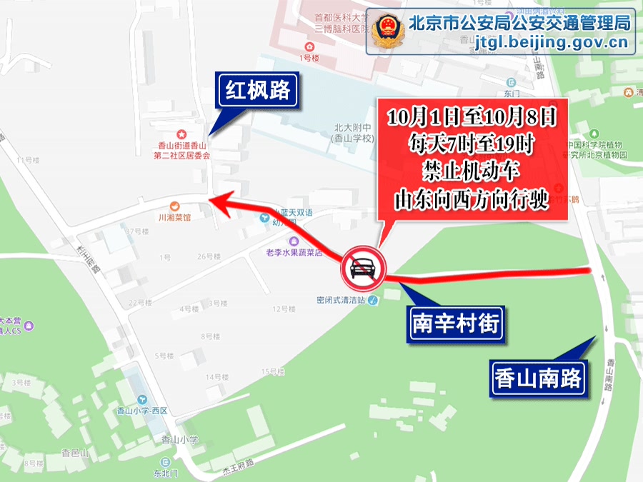 香山地区10月1日至10月8日,每日7时至19时,海淀区南辛村街(红枫路至香山南路段)禁止机动车由东向西方向行驶。