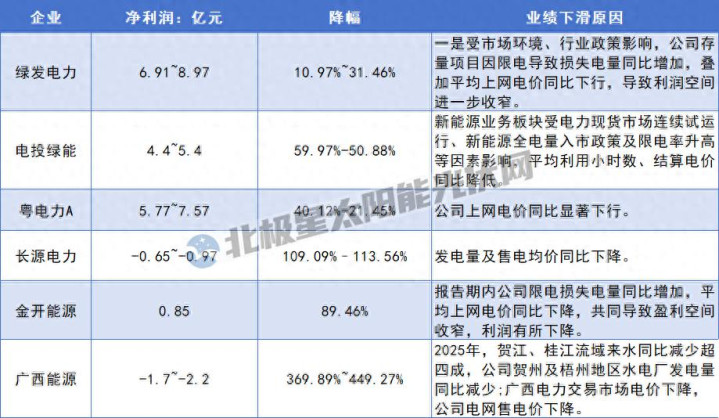 然而,规模的狂飙突进也带来了新的挑战。消纳能力滞后与市场化改革深入,共同挤压了电站开发排头兵——电力企业的盈利空间。2026年初,随着上市电力企业2025年度业绩预告陆续披露,行业转型期的阵痛开始显现:电投绿能净利润同比降幅近六成,金开新能源净利润暴跌超八成且扣非后陷入亏损,粤电力A、绿发电力等企业也未能幸免,净利润均出现不同程度下滑。